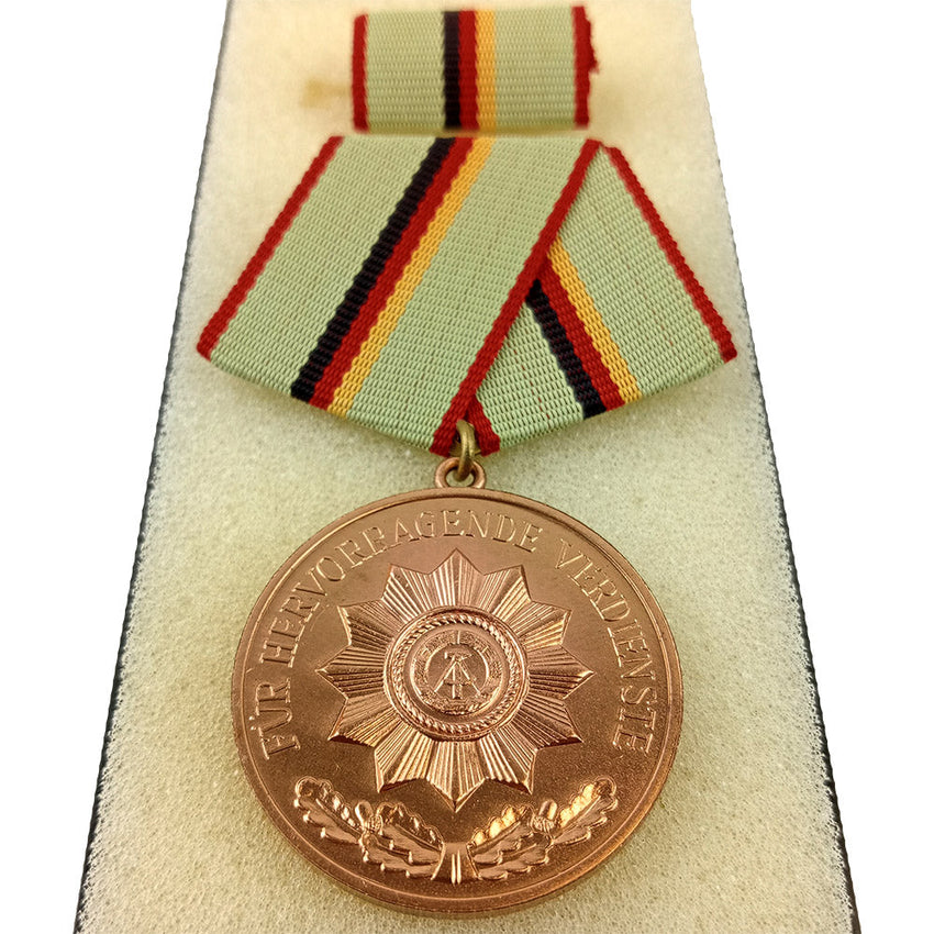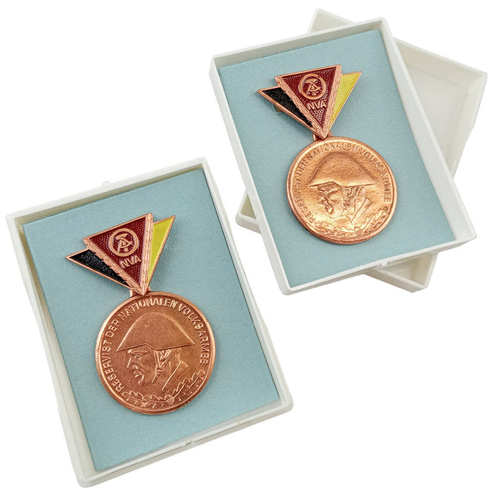 The most common boxed medal & ribbon bar (the second image with the green ribbon) is the Medal of Merit of Organs of the Ministry of the Interior (for public order & security). The second most common (3rd image with red ribbon) is the Medal for Faithful Service in the Militarised Organs of the Interior Ministry (25 years (!?)). At least 1 NVA medal, per pack, is is the Medal for Faithful Service in the National People's Army Reserve.