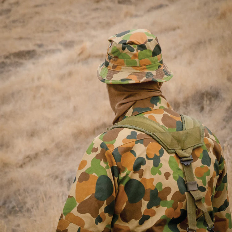 This 'Giggle' hat has been designed around military jungle styles. Known to Australians as a 'giggle' hat, it is otherwise known generally as a boonie or to kiwi troops, a 'J-hat.' These hats have a short brim to provide sun cover in forests yet stay out of your field of vision.