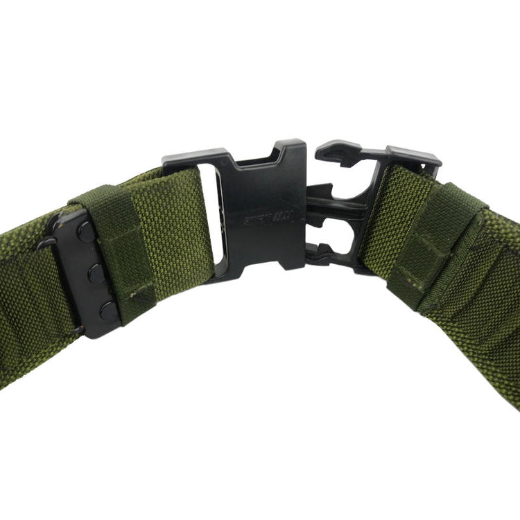 This is a British Army issue belt made from a heavy-duty webbing. To fasten things up, it has an oversized quick-release buckle and two metal d-rings for yoke attachment at the back.