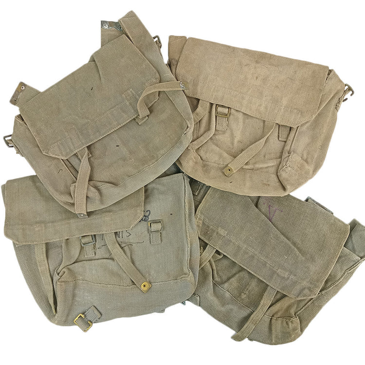 These haversacks were the pack mule of both British and Commonwealth forces during World War 2. The 1937 pattern served all over the world and continued to persist with reserve units well into the Vietnam War (and in some cases after). Some have Belgian postwar markings, many have faded.