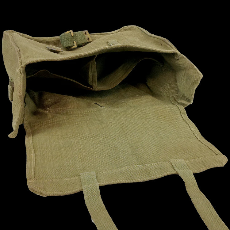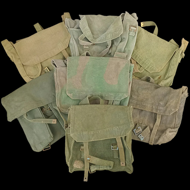 These haversacks were the pack mule of both British and Commonwealth forces during World War 2. The 1937 pattern served all over the world and continued to persist with reserve units well into the Vietnam War (and in some cases after). Some have Belgian postwar markings, many have faded.