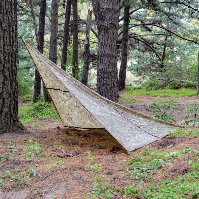 The sides have eyelets and webbing loops around the edges so you can fix it down with pegs and cords or raise it with tent poles. The nylon has a waterproof coating and the middle seam has a silicone seal so you can keep your gear/yourself dry in bad weather. Camouflaged fabric helps keep a low profile while camping or hunting. Don't leave on your next outdoor excursion without one!