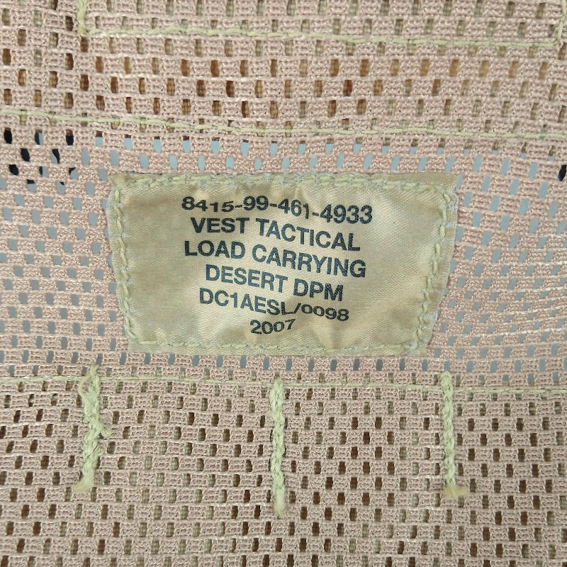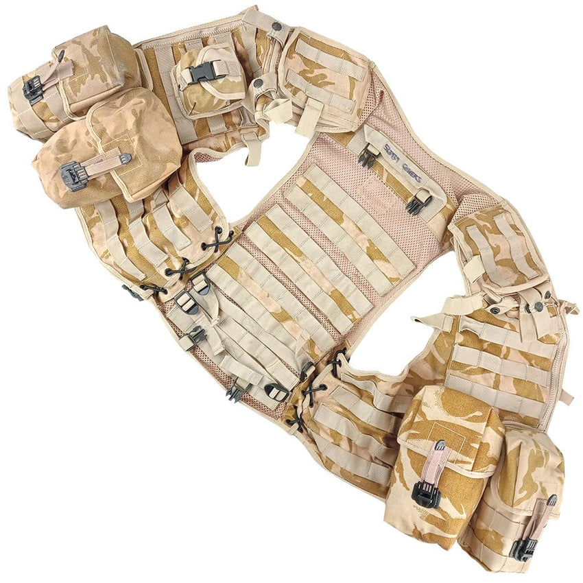 Here we have a UK issue tactical load carrying vest complete in desert DPM camo. This batch came with less pouches - the upside is you have a near blank canvas to add your own choices with the MOLLE system!