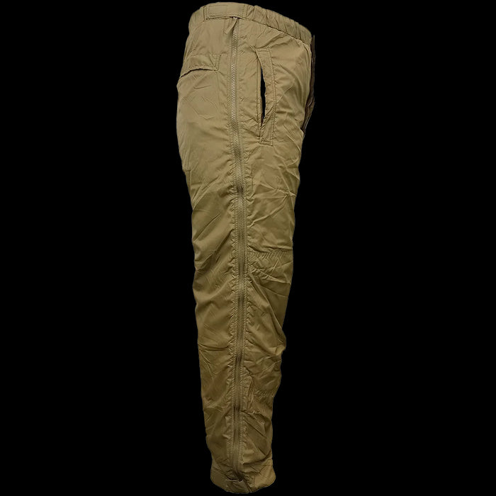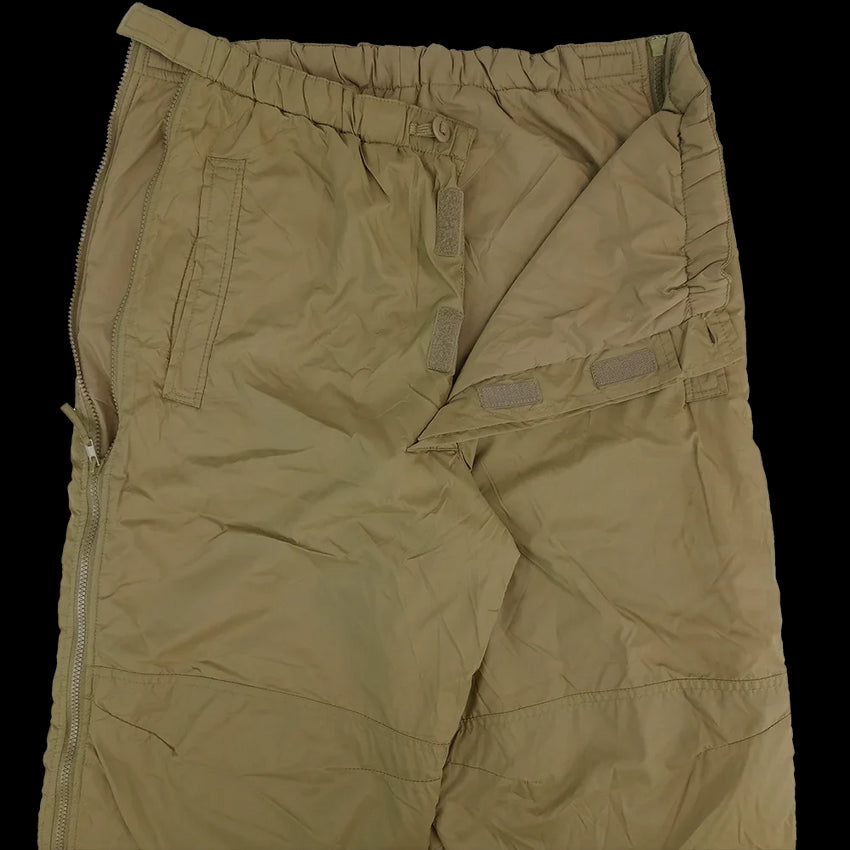 As part of the British military's Personal Clothing System (PCS), these were to be worn in colder regions, layered appropriately. Like the jackets, these trousers have a lightweight polyester lining for heat retention which has a cosy, cloud-like loft to it. A nylon exterior provides some water resistance and compliments the light weight specs of the thermal system. These are not big on storage (1 back pocket) but you can access your undergarment's hip pockets with the slash openings. With some patience and origami, the trousers may be stored in the back pocket. Full length zips to the sides allow you to don/doff easily, or grab some speedy ventilation. Grab one while you can and stay toasty.