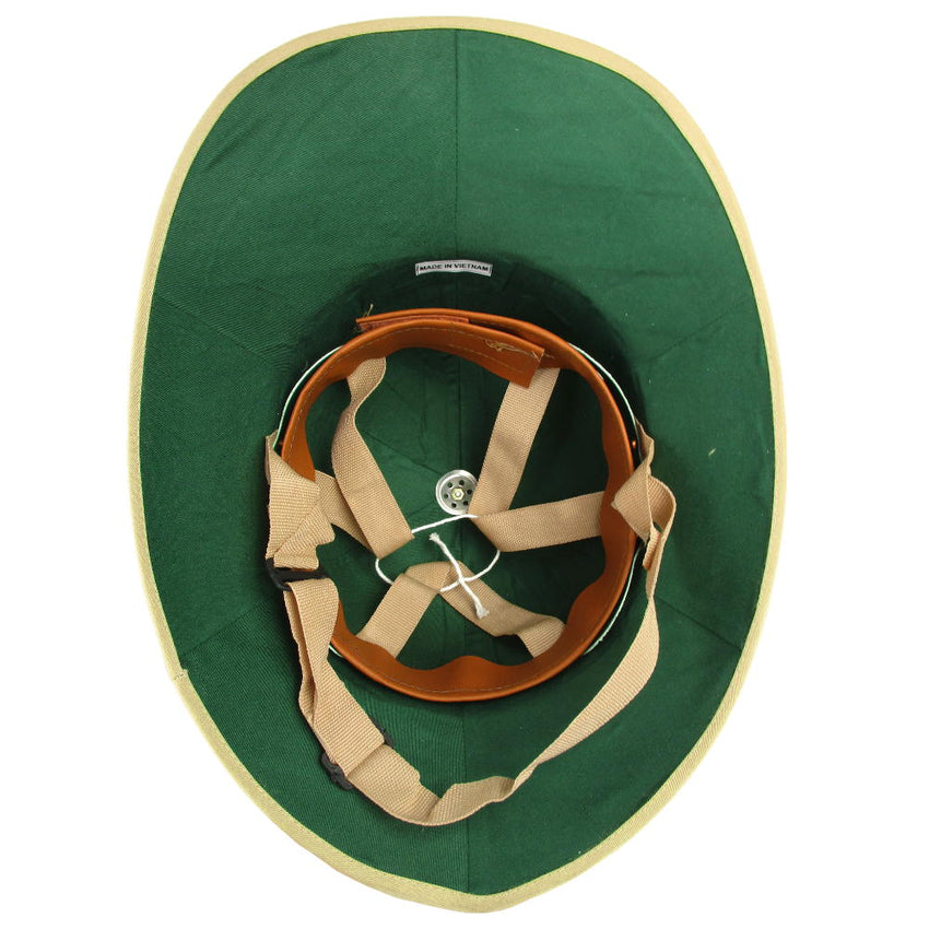 The Wolseley pith helmet is made from the cork, or pith, of trees from northern Vietnam using techniques developed 100 years ago by the French during their occupation. The helmet is functional in both sunny and rainy weather. Adjustments to the size can be made with the interior hook and loop strap and chin strap. An iconic look and a stand-out sight to see these days.