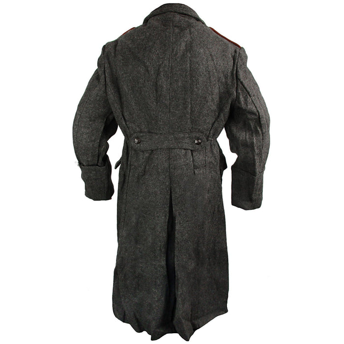 Issued during the Cold War era in Bulgaria as a full length overcoat that extends down past the knees and keeps you warm with a high wool content in the fabric. The front flap secures with six buttons, starting just below the collar and finishing at the waist. Additional details like the red trim on the epaulettes and collar make this piece stand out against other military coats. The cuffs are rolled back and stitched in place. Give yourself to the darkside and let the coat wrap you in its embrace.