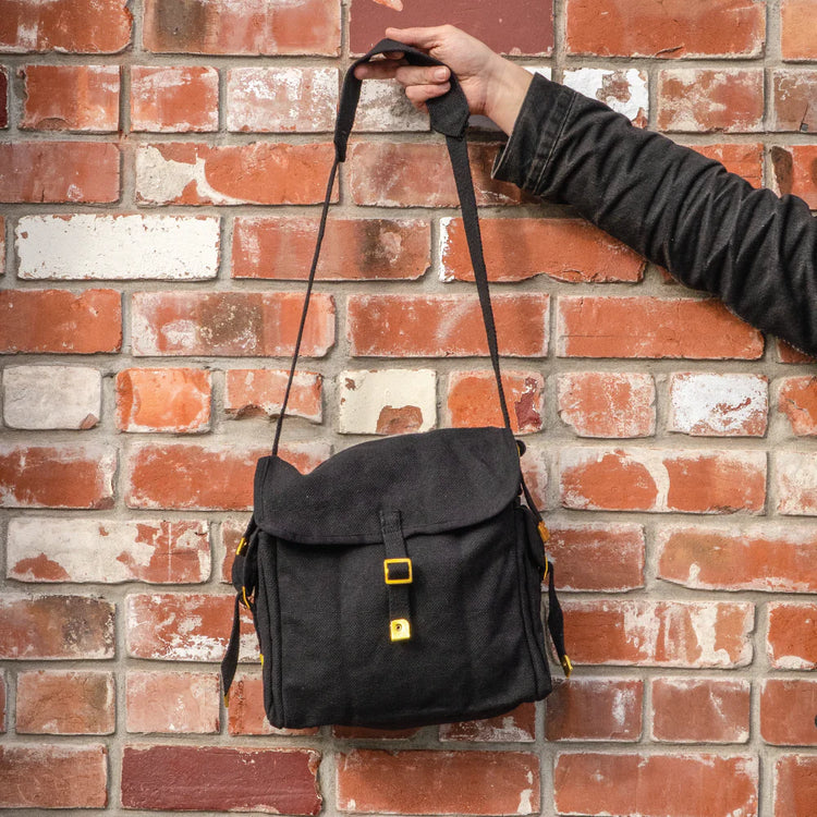 If you're looking for a great everyday bag, then this one is for you. This large canvas haversack is perfect for daily use, the large main compartment and additional side pouches are ideal for carrying your lunch, modern day gadgets, even a rolled up jacket. The cotton canvas construction is complemented nicely with the gold coloured metal tabs. A trendy bag for town and nice and versatile for a quick walk in the wilderness.