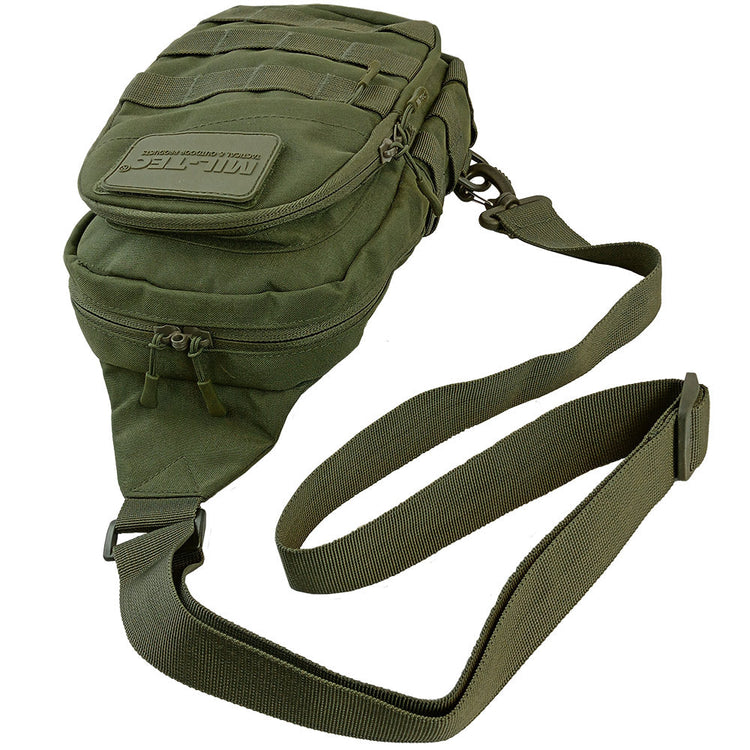 Aww, a cute wee fella. Look at that, he can hold all your essentials when you're on the move. What a champ. This bag from Mil-Tec has a surprising amount of space and pockets for a quick sling n set off down the road. This wee champ has one zip pocket to the front, a zip compartment behind this (with an elasticated mesh sleeve) and behind these is the main zippered (able to pass a lock through these zips) compartment which has two zippered pockets (one mesh fronted). To the back is another zippered pocket which takes up pretty much the whole back panel.