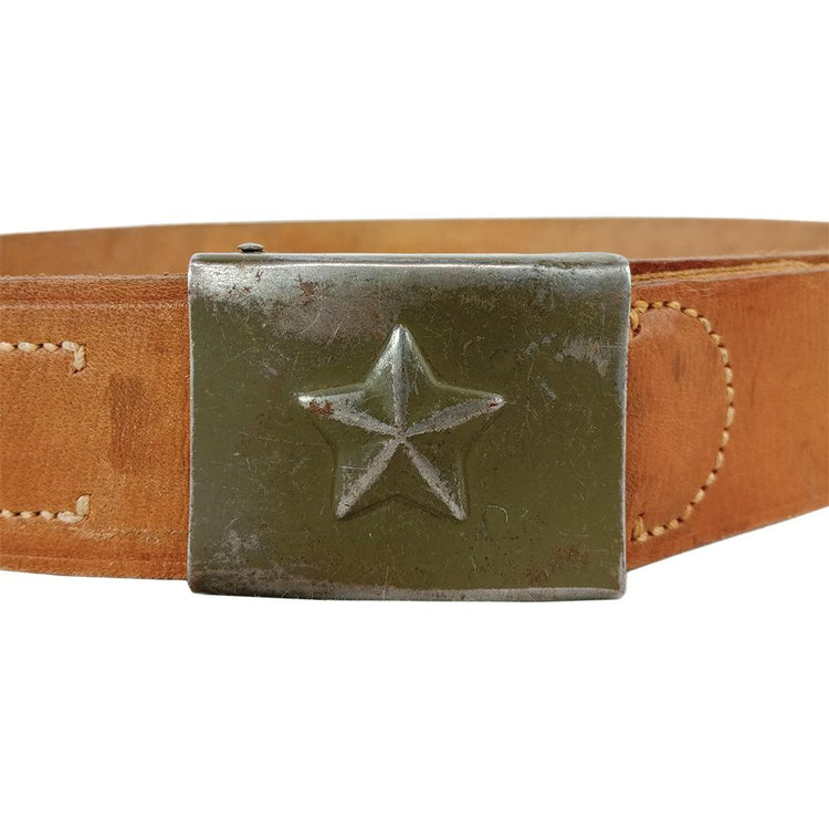 This service belt is surplus of the Army of the Czech Republic. These are mostly dated around the 1980's and is constructed from sturdy leather with a steel buckle. The design is influenced by German service belts from the WW2 era. An embossed star emblem is a prominent feature on the buckle. There are some scuffs and scratches on the buckle, although it adds to the genuine and vintage feel of the belt. It's a nice piece for a collection and a bold look around the waist.