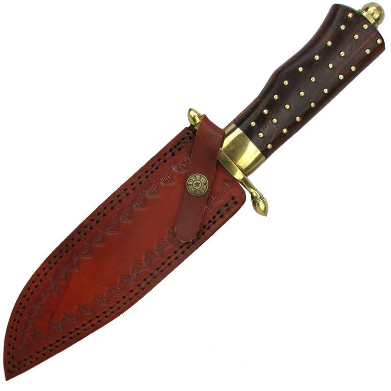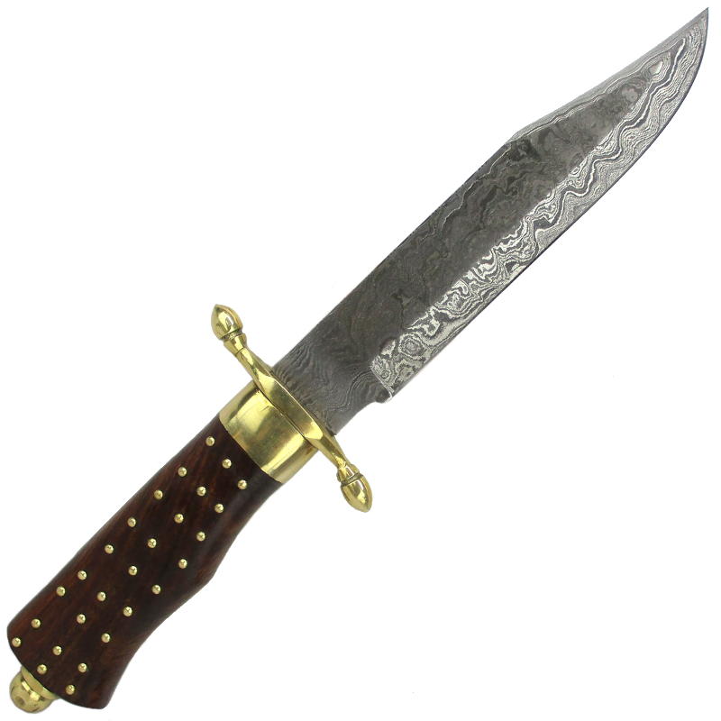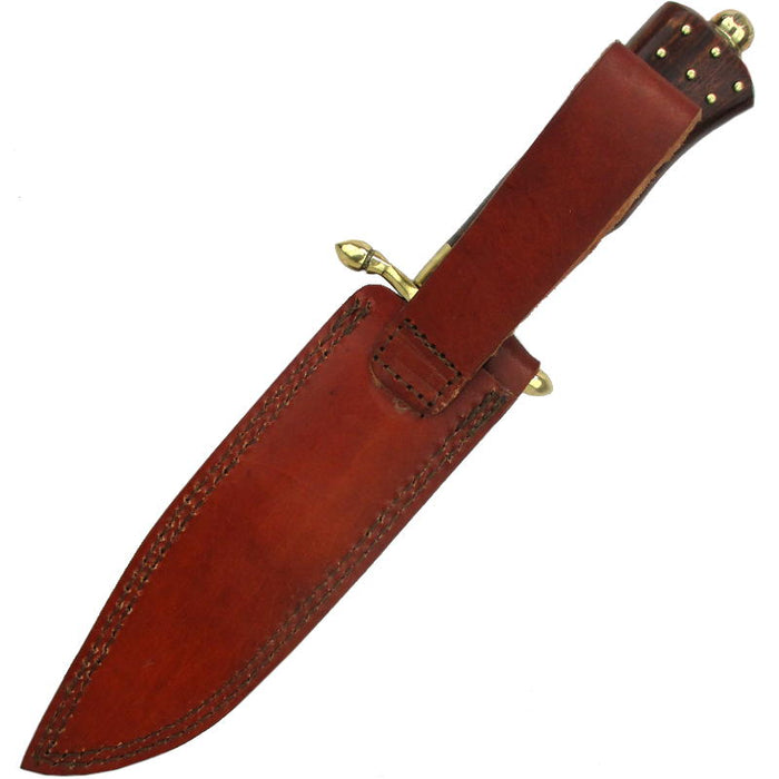 Call that a knife? THIS IS A KNIFE! A large, clip point bowie knife. Complete with wooden handle, brass pommel and hand guard, this knife can handle itself. Made from carbon steel with a patterned finish. It comes with a embossed leather sheath which can mount on your belt with a simple loop. Hunting crocs will be no trouble for this bowie knife!
