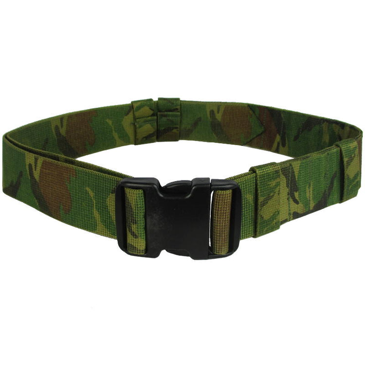 These belts are genuine surplus from the current Dutch forces. They feature a heavy nylon construction with a large plastic buckle. Webbing around the side is useful for ALICE clips or other equipment you may want to hook on. The camo pattern is based on the British DPM (Disruptive Pattern Material) but differs slightly by having more muted colours.