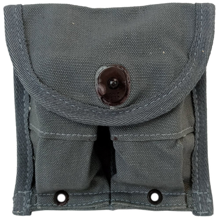 These pouches mainly function like their US counterparts however the main difference is the loops at the rear - they are not as wide and don't fit over a carbine stock (as many US troops did with theirs). Instead they will happily fit web belts up to 7cm in width. A single snap stud closure secures both magazines and the pouch itself is made from durable cotton canvas.