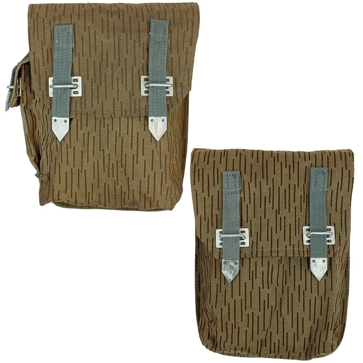 Common to all of these pouches is the rain camo pattern strichtarn, clasps to the front, belt loops to the back and they all have 4 cell divisions inside. The last iteration of East German uniform, UTV, included these pouches with green trim. Having fabric divisions and construction, the capacity can vary but these should happily fit 4x AK mags. Most of these pouches are in really nice condition but some show grime or a little storage corrosion.