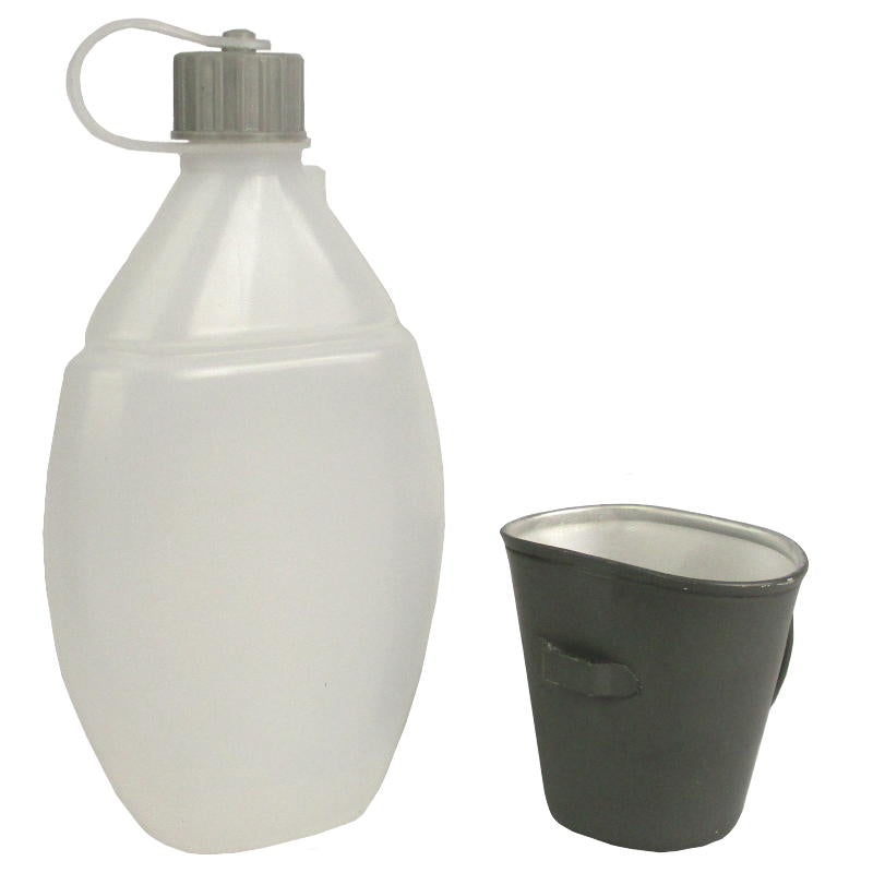 Get the complete canteen set of the former East German Army (or NVA - Nationale Volksarmee). Similar in design to the German WW2 canteen in which the cup is strapped on top of the canteen using the insulated cover. The canteen will hold approximately 1 quart (0.95 litres) of water.