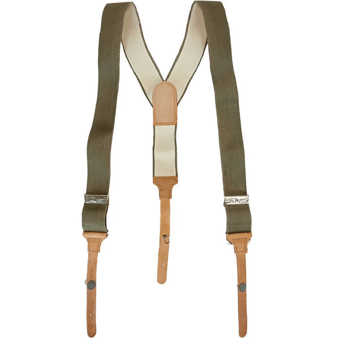 These original Y shape braces are made from woven elastic (pearl to the back side, that lovely somewhere-between-olive-and-grey (steingrau) to the front) with metal adjustment clips and rings. The elastic still has a nice springy nature to them but does show some folding warping from storage, when not taught. Also part of the construction is some pretty nice inoffensive, thick brown leather strapping that fixes to your trou of choice by looping around, inserting the metal loop, and rotating. Lets not forget the cute grey button to top it all off.