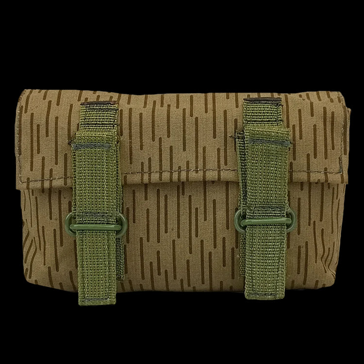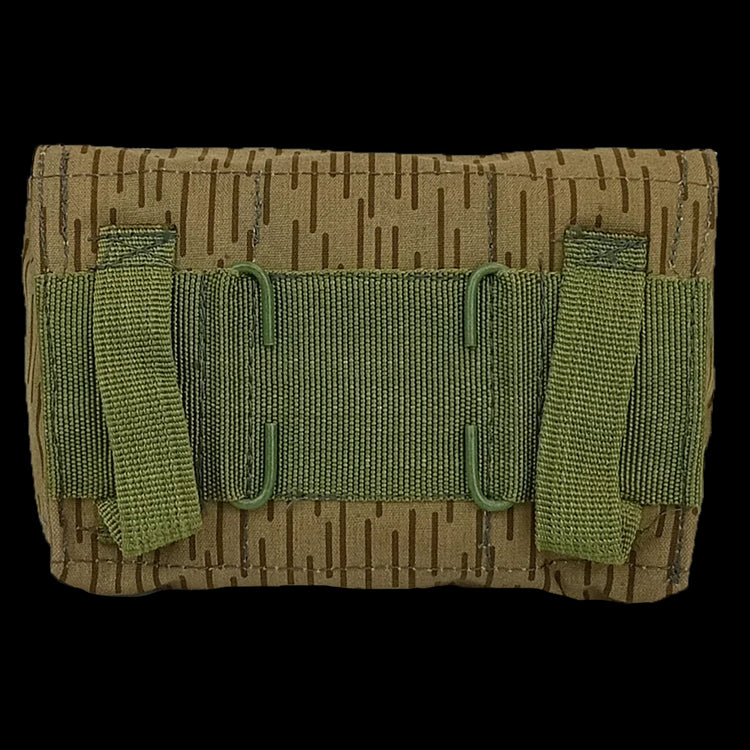 Once with a sinister purpose (holding 3 grenades) these are now rendered down to insanely cute wee pouches. ...Unless you want to hold 3 grenades. From the now extinct ''East Germany'', these have your classic brown rain camouflage, strichtarn, paired with the classic UTV style green accents. These pouches have fabric internal divider (very flexible) and the usual suspect belt loop & wire attachments to the back. A rubberised cotton canvas construction on a nice wee strichtarn accessory, what's not to love?
