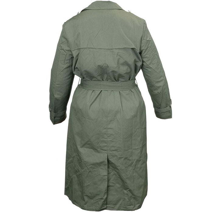 The women's cut of this jacket varies only slightly to the men's, where the front fastening direction is opposite and small darts in the bust area. They're not the shapeliest trench but the fit is adjustable with the waist belt. These have a water resistant outer and rubberised interior, additionally a layer around the upper inner torso assumed to act like a moisture vapour permeable layer. These come with belts (stashed in the pockets), adjustable belted cuffs and buttons on the underside of the collar to attach hoods which are unfortunately not included (though a few have a surprise hood stashed in a pocket too). Rank insignia can be attached via small loops and buttons to each shoulder. There is a little variation in hue to these coats but all are a degree of olive drab and in excellent quality, appearing to be unissued. The rubberised interior is in good condition but may be susceptible to abrasion wear, due to their age. The trench itself is very lightweight and packs down to a small size. Keep one handy to keep the rain off your rain camo, complete a kit or just generally stay dry in normal everyday situations.