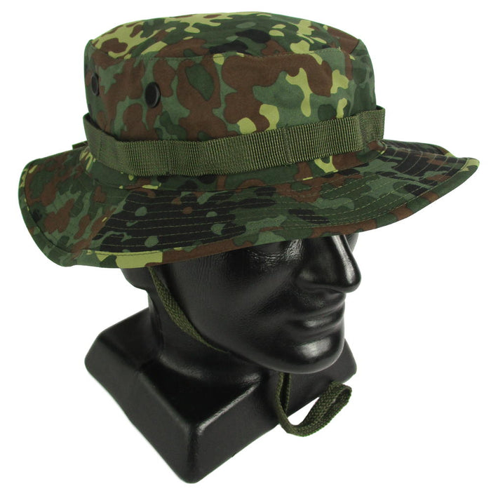As with all good boonie hats, this one features a foliage ring for adding vegetation for improved camouflage. It also has two ventilation holes on either side. An adjustable chin strap completes the boonie hat design. To top it off, this hat comes in the popular flecktarn camouflage. A classic hat for fishing, hunting and hiking, providing essential protection from scorching sun rays and wet weather.