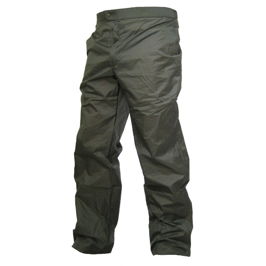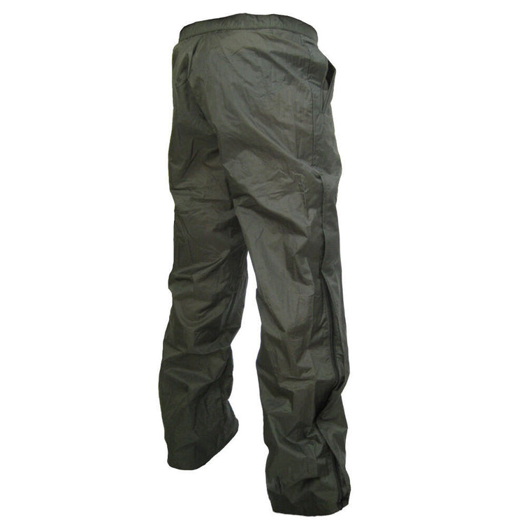 Socovat French Army rain trousers. Elasticated waist, right hand slash pocket and thigh-high leg zips to don these trousers over your boots and gear. These are great lightweight Olive Drab coloured rain trousers from the French army. This is a perfect choice for any outdoor enthusiast, from hunters and airsofters to campers and fishermen.