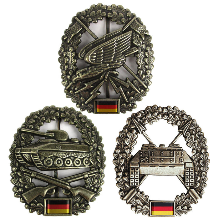 These German beret badges are quality made and highly detailed. They feature a variety of 'scenes' that represent sections of the German army.