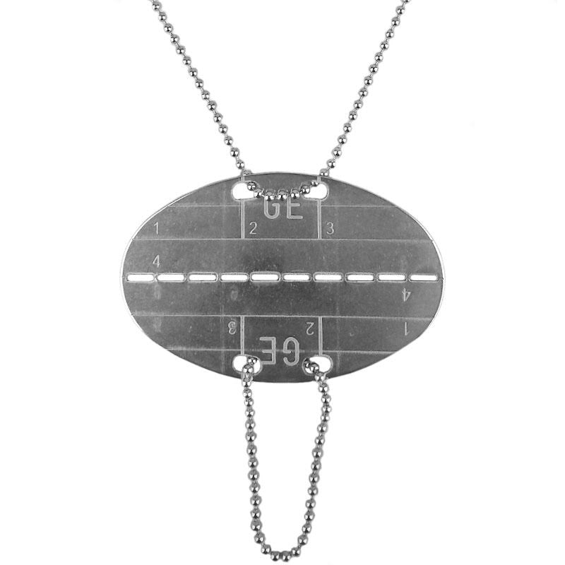 Here we have a reproduction of the modern Bundeswehr's (German Army) dog tag. The only notable difference is the current versions have 'DEU' stamped instead of 'GE.' This oval design dates back to the First World War and is still in use today.