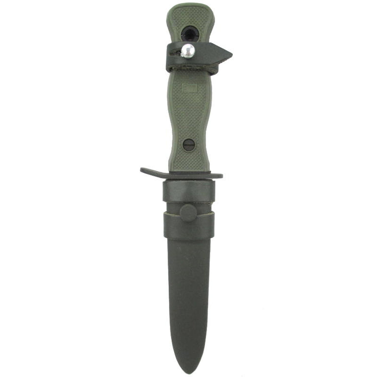 These knives are a quality replica of the German Army knife currently in service. Made by its close neighbor in Italy these bare their Italian factory markings instead on the Bundeswehr's. The knife consists of a long drop point blade made of stainless steel coupled with offset handguard. The handle is made from a robust plastic with a textured surface for a firm grip. All of this comes in a bayonet like metal sheath with a thick leather frog ready to mount on a belt. A great knife for the next hunting or camping trip!