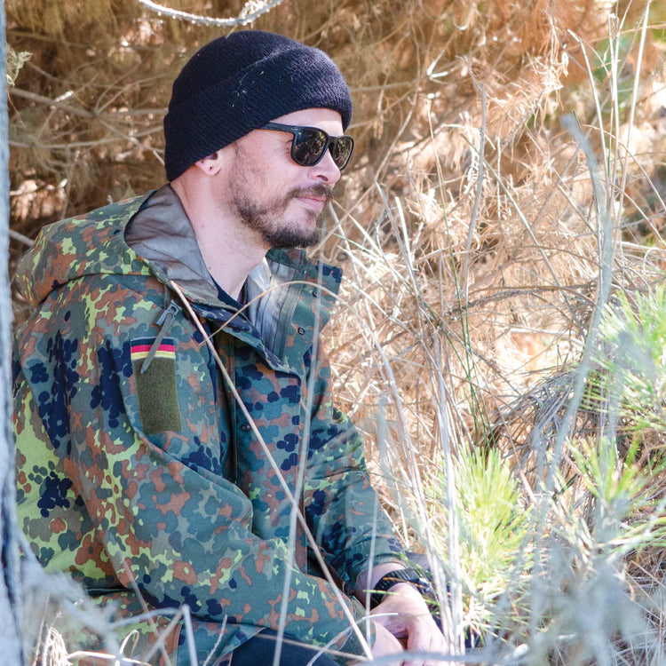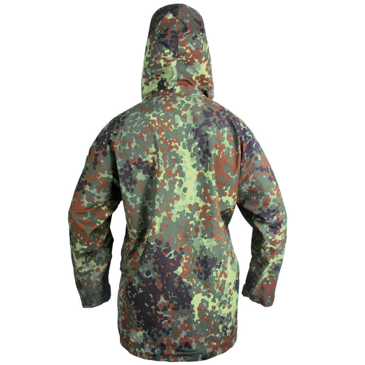 This German flecktarn jacket is a high quality, lightweight, and waterproof piece of clothing. The flecktarn pattern is a favourite among camouflage enthusiasts making this jacket an excellent outer layer for the colder times. These ''water vapour permeable 3-layer laminate'' garments have a breathable, waterproof and windproof quality, thanks to the clever construction. Being German, the permeable membrane is likely Sympatex (even better than Gore-Tex) though manufacture varies and these are dated around the 1990's.