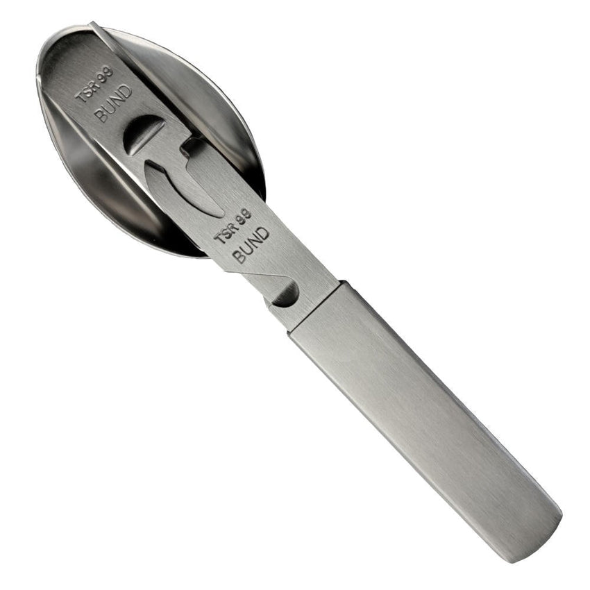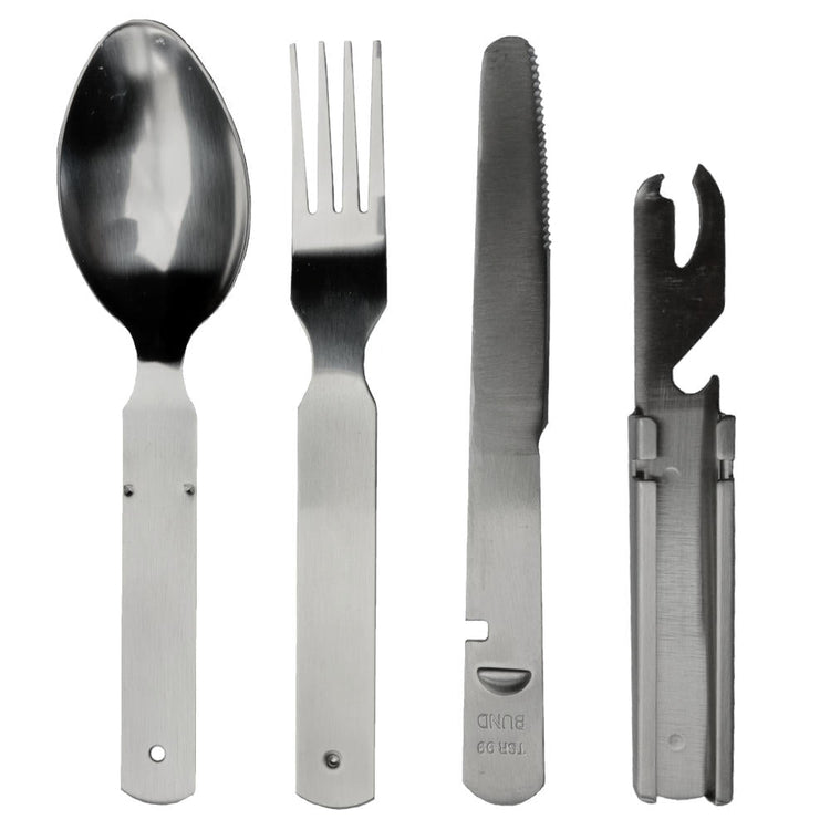 This German Repro Stainless Steel Cutlery Set from Mil-Tec is made from high-quality steel and includes all the essentials for mealtime on-the-go - a knife, fork, spoon, and can and bottle opener. All pieces fit together conveniently for a compact package, making it an ideal choice for hikers, campers, and other outdoor adventurers. Enjoy meals in style, wherever you go.