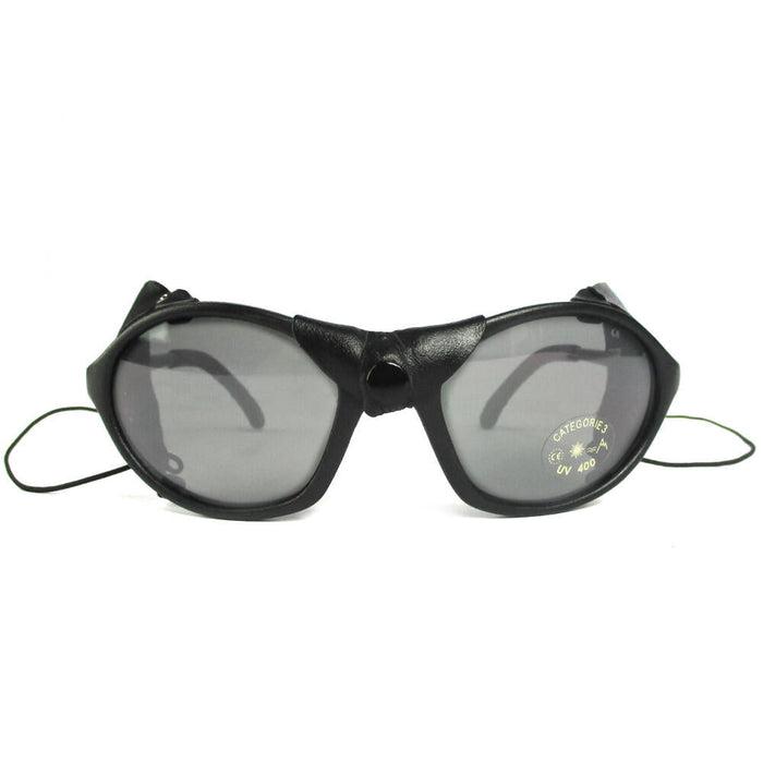 Keep your eyes fully protected with these glacier sunglasses. Removable leather covers prevent lateral light from effecting your vision, a common problem when light reflects off snow. Take off the covers to give these glasses a more casual appearance. The UV 400 lenses will protect your eyes from 99-100% of UVA and UVB radiation. They are also protected with an anti-fog/anti-scratch coating. The rubber ear pieces provide a comfortable fit while preventing the glasses from sliding off your head. Comes with a carrying pouch.