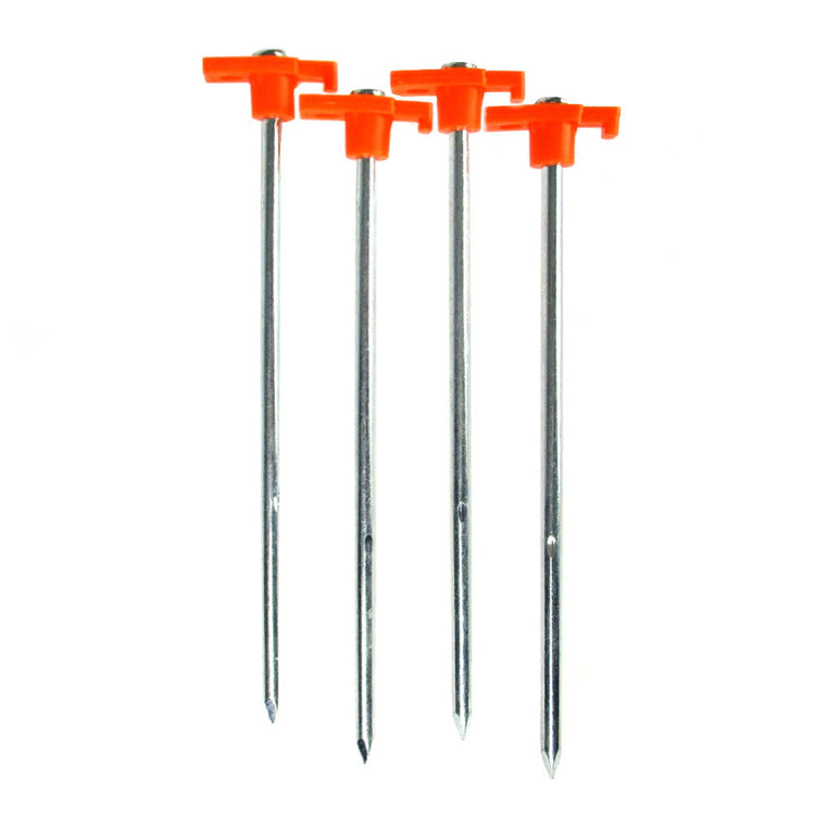 This tent peg set comes with 4 heavy duty pegs, measuring 25cm (10 inches) each in length. The flat head makes it easy to hammer while the hook enables easier ground removal. Guylines and floor loops can be conveniently attached to the hook or hole at the top of the peg. The strong, steel plated pegs are ideal for penetrating solid ground and securing large family tents.