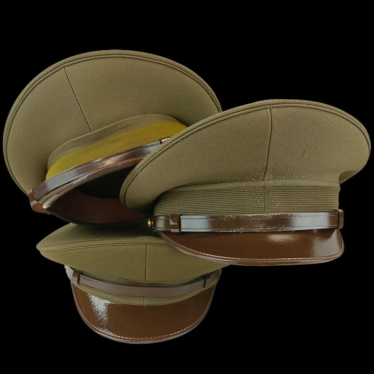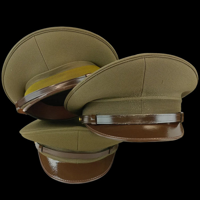 Peaked Italian dress caps. Classic shape, classic colour - not much more to say! A textured olive band runs around the head with a rigid vinyl stiffener in the forehead for adding shape & badges. Complete with stiff vinyl visor, all made in Italy and sourced from various manufacturers.
