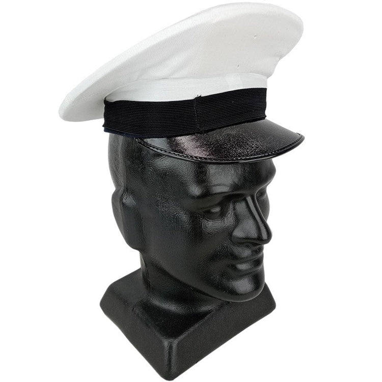These peaked caps are what Italian Navy officers currently wear with their dress uniforms. A black band runs around the head with a rigid vinyl stiffener in the forehead for adding shape & badges. On the inside is a leather sweatband that you can bend into shape somewhat and maintain a good grip on your head. Complete with stiff vinyl visor, all quality made in Italy.