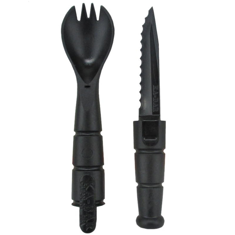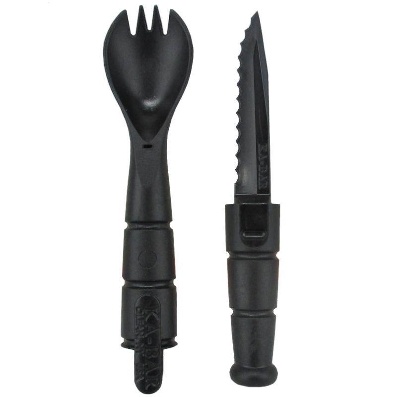If your camping in the great outdoors then these Ka-Bar tactical sporks have got you covered for chow time. In true to form Ka-Bar fashion, the spork features the iconic grooved grip. Simply pull on both ends to separate the blade from the spork (these clip back together securely with tabs). The cutting edge has sharp serrated edges so you can cut your way through a good ol' steak with ease. The spork has short fork edges so you can pick up your food no problem and still be deep enough to get through a cup of soup.
