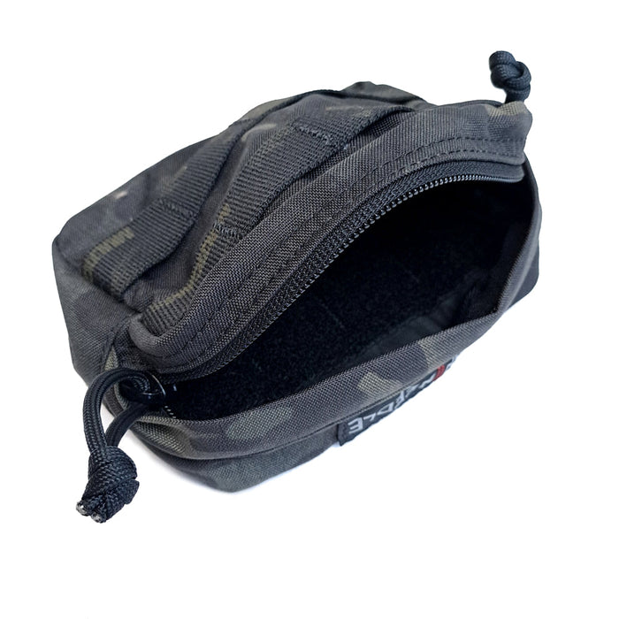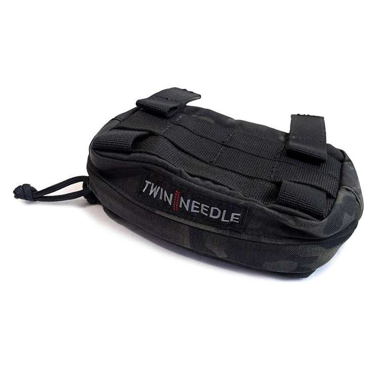 A pair of MOLLE rucksack side pouches and small utility pouches in Multicam Black. Used by an Ex-New Zealand Defence Force service member who's added a dusting of spray paint over them. Manufactured by TwinNeedle NZ.
