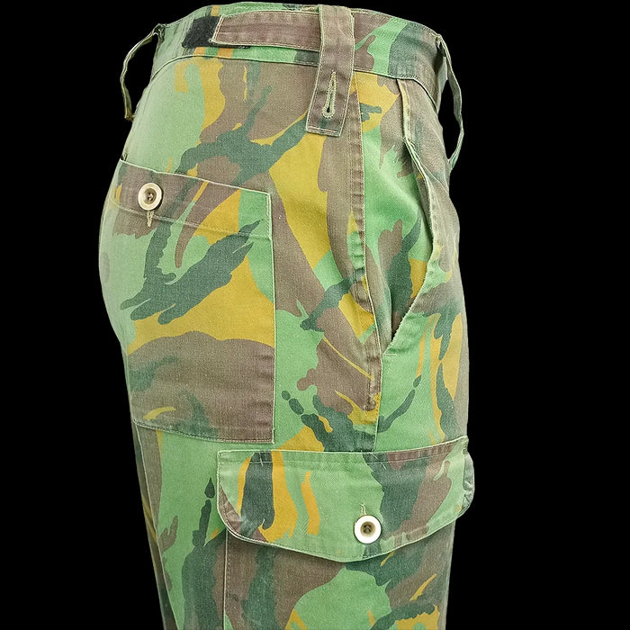 These trousers from around the mid the 80's have a classic mishap of NZ camouflages - weird colours. These are adorned with blue-greens, ultra mustard yellows. Quite outrageous and when faded, even more so. As these were a winter weight fabric, eventually people realised this uniform was not only difficult to blend in with, but too heavy for New Zealand's climate. These are one for the collectors!