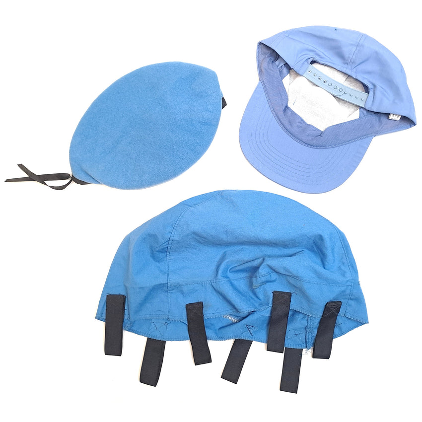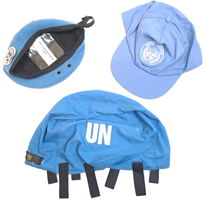 UN beret with badge, UN baseball cap with patch, and UN PASGT helmet cover.