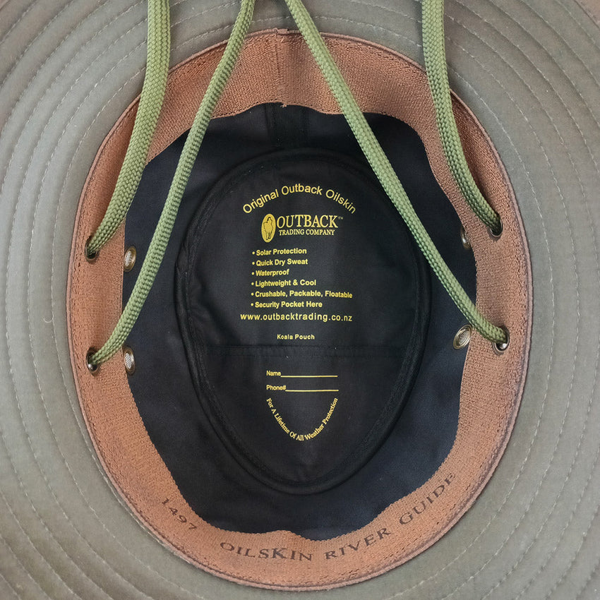The poly/cotton construction is quick drying and water resistant. The nature of the oilskin takes on a distressed appearance with wear, nice and rugged. Features of the hat include a (removable) chin strap and snap-up sides. A small security pocket or "koala pouch" is on the underside of the hat. Protect yourself from the sun and pick up one of these hats for your summer adventures.