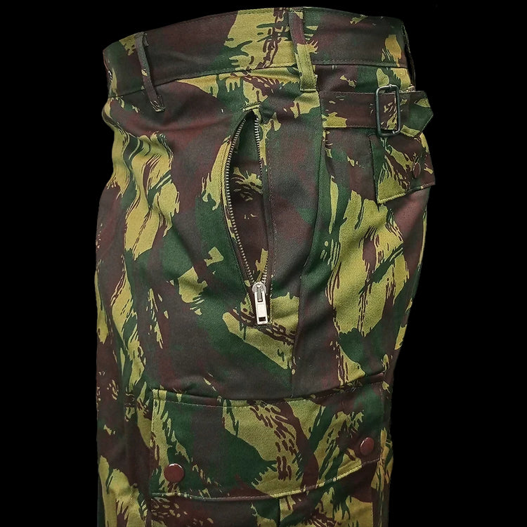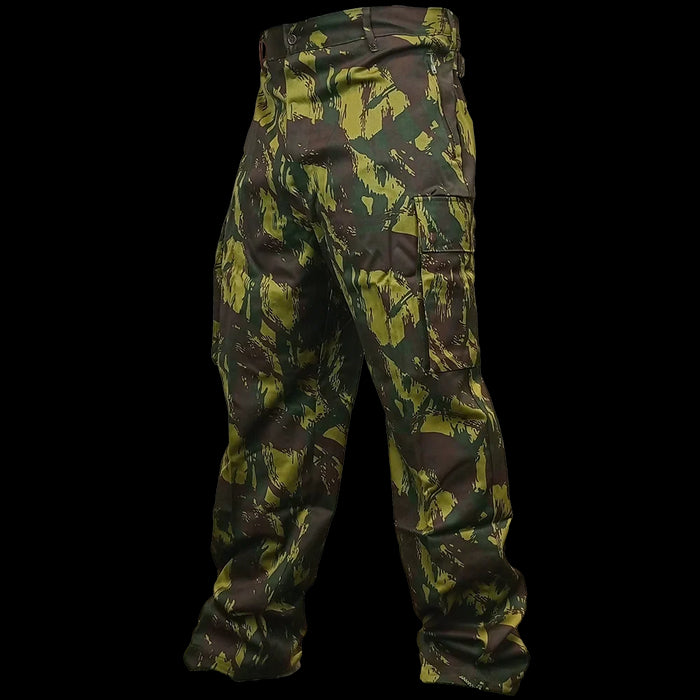 These Calça Camuflada (Camouflage pants) from Portugal showcase another snazzy lizard pattern, ''influenced'' by the French versions. Distinguishing this pattern from the French lizard camos is the vertical orientation of the pattern. An uncommon uniform item in an uncommon size break - for the moment we only have these in size XL! Rejoice! Saúde!