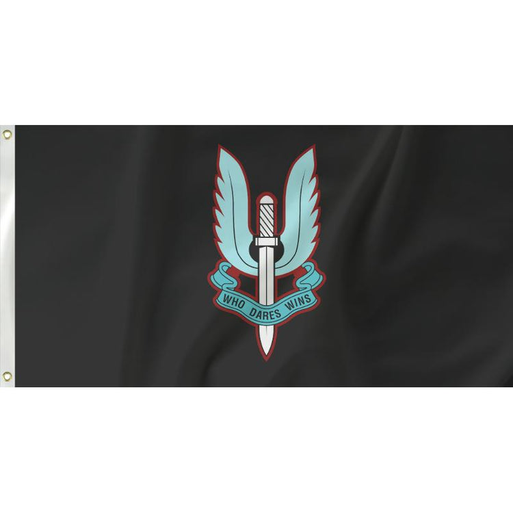 Show your support for the SAS with this distinctive flag. Completed with metal eyelets on the left side to attach to flag poles . Measuring 155cm x 90cm it will fit nicely in your house or workplace. Show your dedication and pick up a flag today!