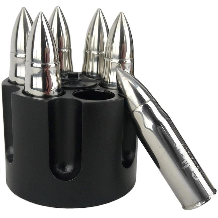 Give your drink that extra ice cold bang with a stainless steel bullet chiller! Completely tasteless and food safe, just keep them in the freezer until icy cold. The bullets come complete in a revolver cylinder (wrong type of rounds, but hey - looks cool) for easy storage. No more spilling your icy tray in the freezer with one of these bad boys, liven up your bevy today!