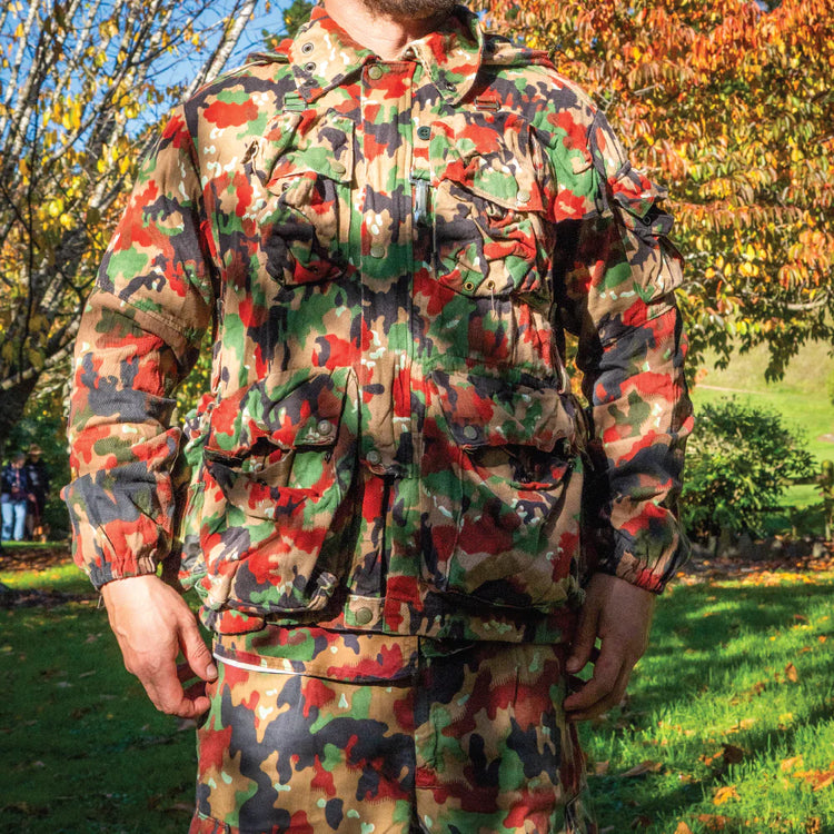 This Swiss army M70 jacket was the pinnacle of quality and versatility for it's time. Issued from 1957 to 1983, this jacket was designed with a huge amount of storage, it's essentially a load bearing system on a jacket! All in iconic TAZ 57 (Alpenflage).