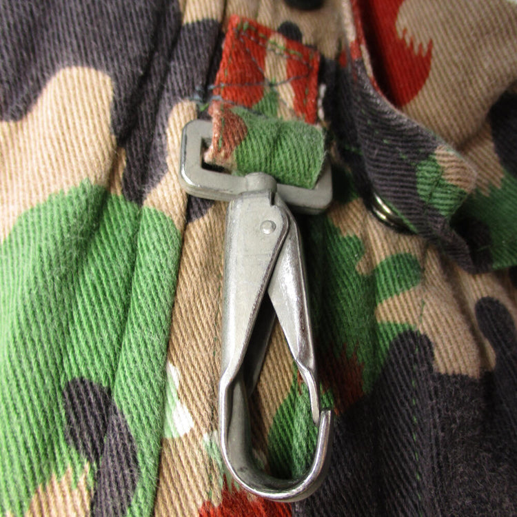 Packed with pockets and pouches to minimize the need of cumbersome packs and bags. Magazine and grenade pouches sit on the chest, while larger pockets are placed around the waist area, perfect for gear and equipment. The M70 is loaded with handy features that made soldiers lives easier. A metal clip placed on the chest was used to carry helmets when not in use. Interior pockets contained weapon cleaning kits, saving storage space. Constructed from a heavy-weight cotton fabric, we estimate it to be around 300gsm.