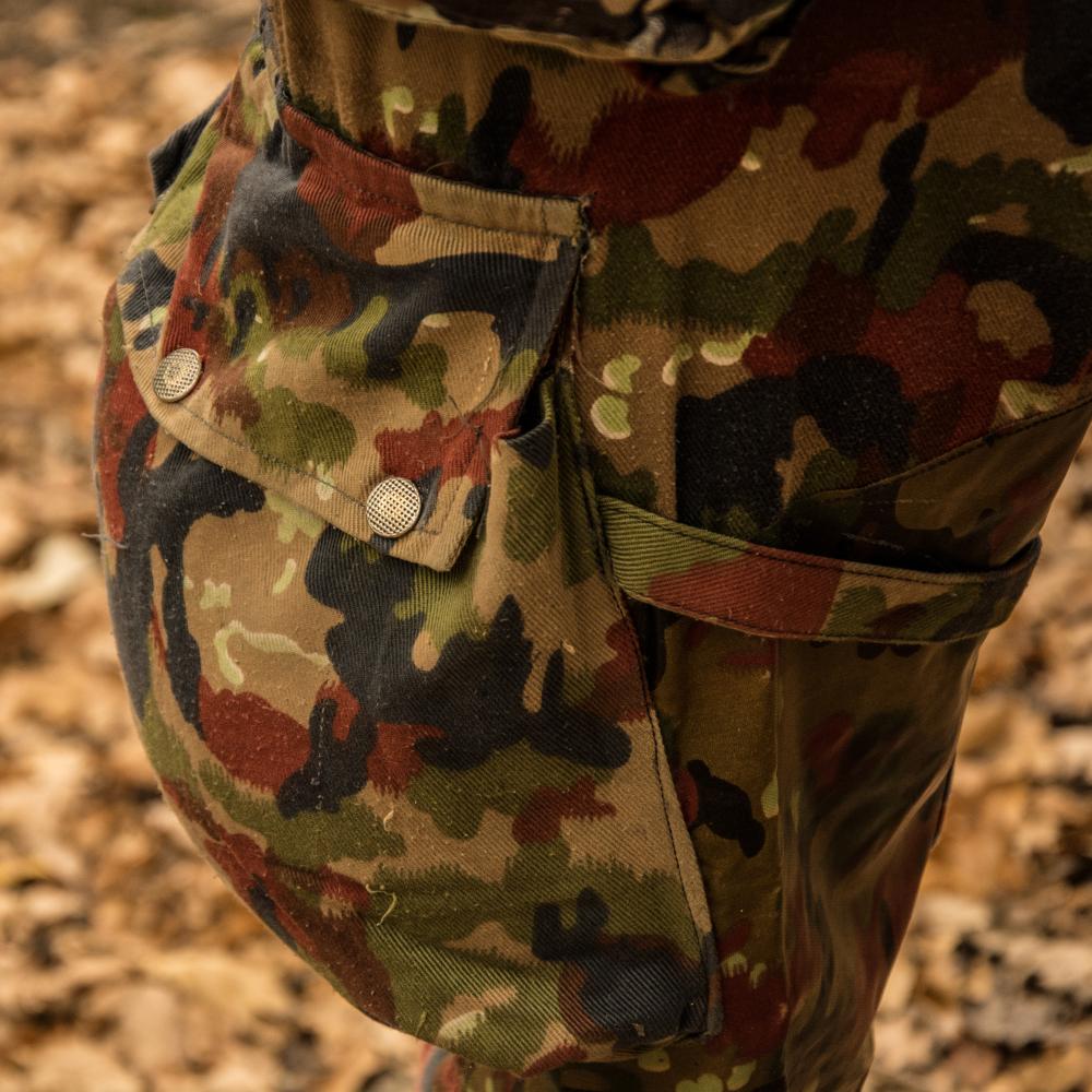 Near the end of World War 2 Germany designed a camouflage pattern called 'Leibermuster.' The Swiss based their Tarnanzug 57 (TAZ 57 also known as Alpenflage) pattern on this. During the 1950's Switzerland decided that it didn't want to have a web-set anymore and the uniform must be able to carry everything necessary for war. The Jacket would take up most of the load, but these trousers still can carry much more than other contemporaries.