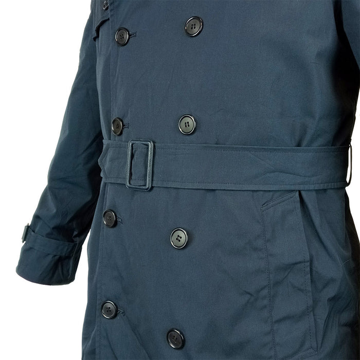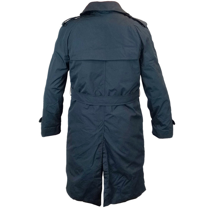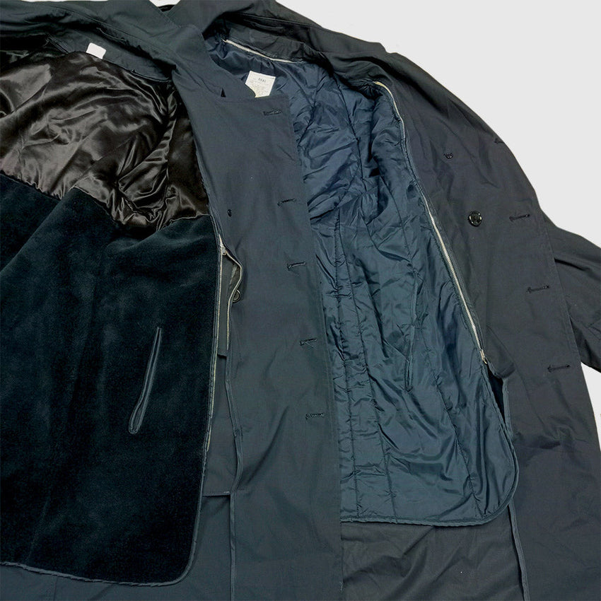 Look sharp and stay cosy, or pretend you're hunting Carmen Sandiego in this belted, double breasted trench coat. In US Air Force dark blue colourway, this trench can blend into it's new civilian life with ease, though it was used over dress uniforms. Not lacking in function, these coats have a zippered removable cold weather liner. There is some variance in lining type (see last photo) between fluffy, quilted or satin (these will be chosen at random). Even with the liner removed, these coats have a comforting density and heft to them. Two hip slash pockets to keep your bits close and an adjustable belt to assure form and fit. Wind and water resistant, keep what's underneath clean and dry. Cheers, US Air Force!