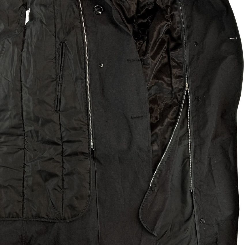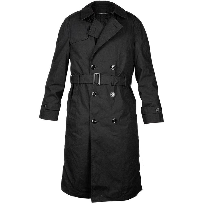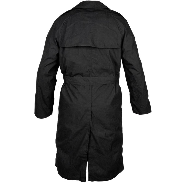 Look sharp, stay cosy or pretend you're in the murkiest alleyways in film noir with this belted, double breasted trench coat. Much the same as the Air Force version, this US Army trench is in a crisp black colourway and was used over dress uniforms. Not lacking in function, these coats have a zippered removable cold weather liner. There is some variance in lining type (see last photo) between quilted (most common), satin or fluffy plush (these will be chosen at random). Even with the liner removed, these coats have a comforting heft to them. Two hip slash pockets to keep your bits close and an adjustable belt to assure form and fit. Wind and water resistant, keep what's underneath clean and dry. Hooah! Snazzy find, cheers US Army!