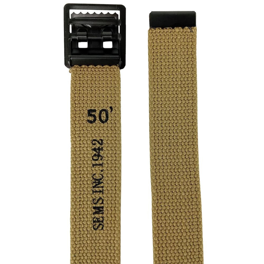 Every US enlisted man needed one of these belts to keep his trousers up during World War 2! A simple cotton canvas belt with a metal buckle that weaves through and torsions in place with its metal teeth. No matter if you are participating in reenactment, airsoft or film productions - you won't be fighting any Jerrie's without one of these belts!