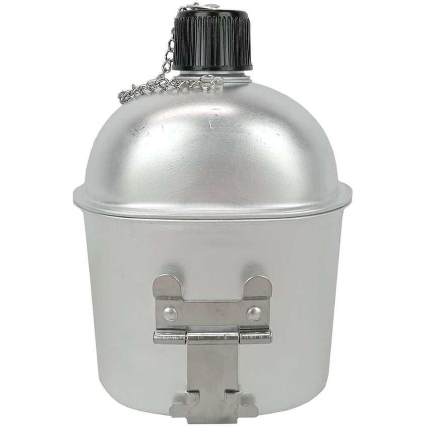 The 1 quart canteen got issued with a L-handle mess tin so you can stay both hydrated and fed. The L-handle packs down easy, locks into place and can stand alone much more securely than other contemporary mess tin designs. A simple chain makes sure you won't lose your canteen cap as well, a very simple yet clever combat design.