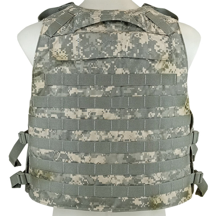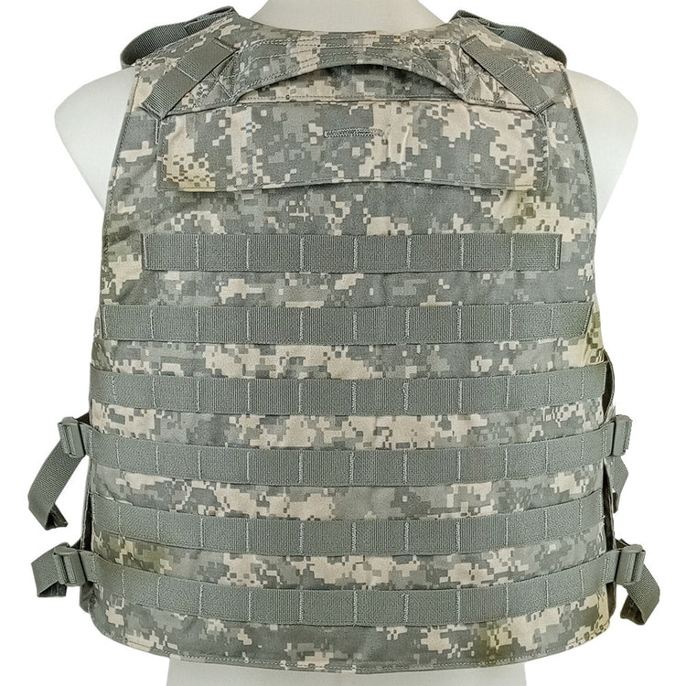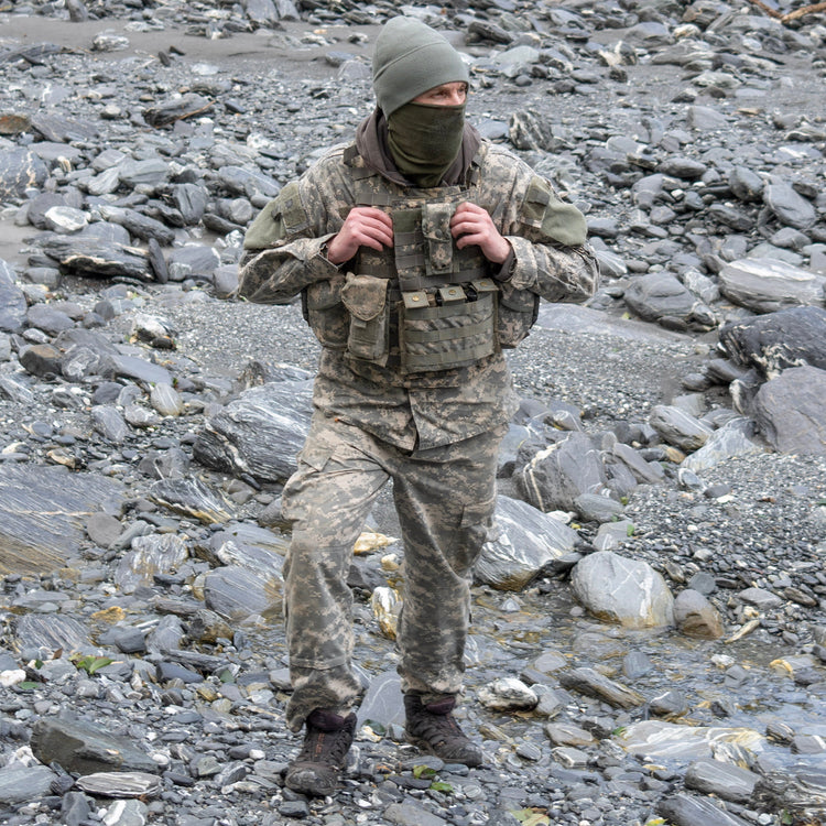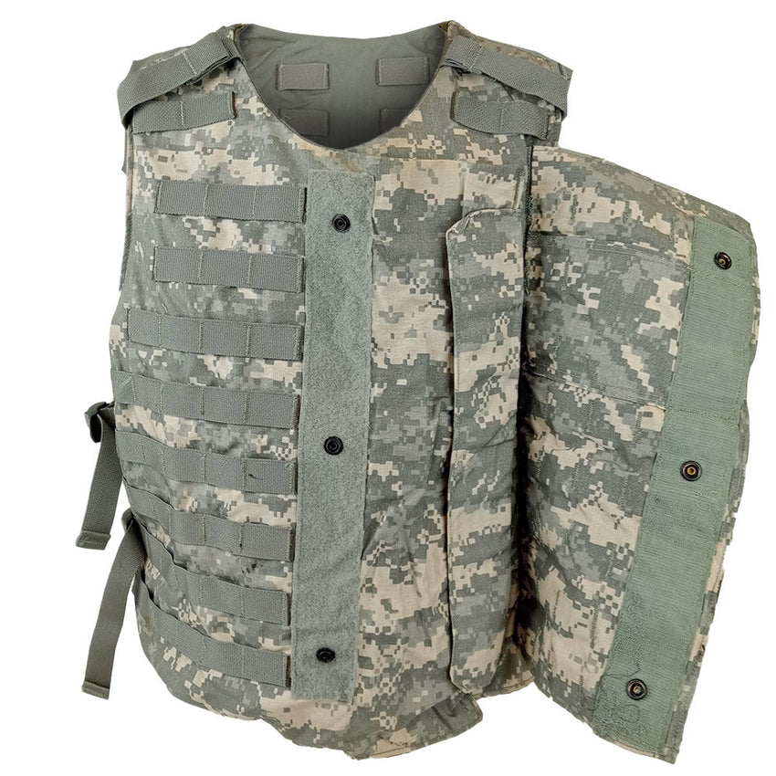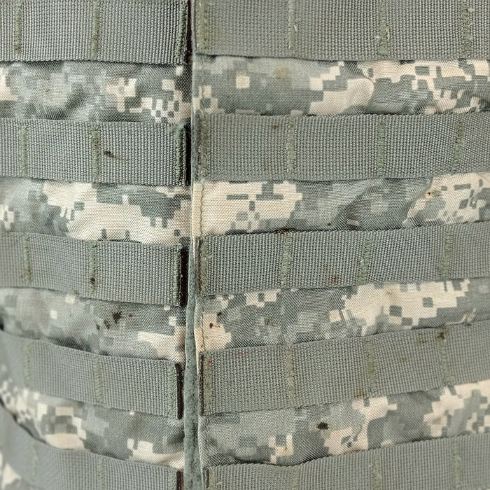 These OTV plate carriers are absolutely the pinnacle of the GWOT era being absolutely covered in MOLLE MOLLE MOLLE! If you find yourself riding on top of a armoured column through downtown Baghdad, make sure you chuck on every single imaginable pouch to keep you in the firefight! These vests you can absolutely cover with the MOLLE system. Speaking of which, it is always an option to add on a extra protective elements with room with plates front & back, soft panels and if you can find them - groin & neck protectors. The sides have a lot of adjustment with easy straps you can pull on to tighten. Getting out of these is also super easy - the front has a hook & loop opening you can peel apart in a jiffy (and snap domes if you really want to stay glued shut). All complete in that lovely UCP 'camouflage'....yes!