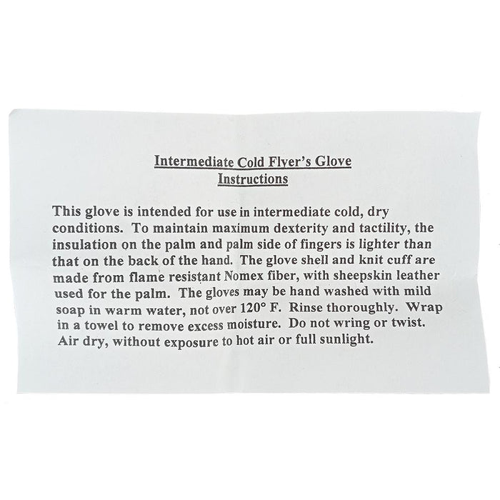 These gloves are what the US Air Force issues to its pilot/air crew for intermediate cold weather climates. What does that mean? Basically not Antarctica or other extremely cold places - the insulation on these are rated down to 15F° (-9.5°C). To grip abrasive frozen surfaces, the bottom of the gloves are made from hard wearing leather. The tops have a Nomex® outer layer but as these are surplus, the flame resistant properties may have deteriorated over time and we can not guarantee the resistance properties of the fabrics. The bottom has a stretchy rib-knit extension which keeps the gloves firmly on your hand as well as trapping the warmth inside.