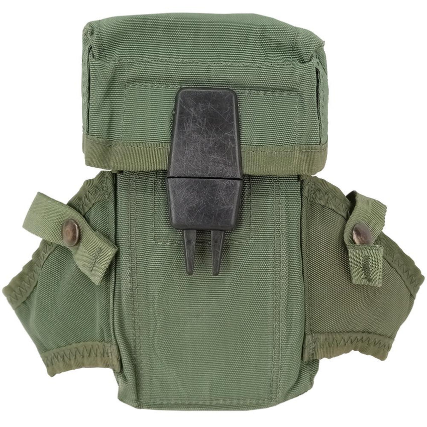 Designed to hold three 30-rd M16 magazines vertically. Also features two side pockets with snap-closure straps that can hold one grenade each. Attaches with two standard ALICE slide-lock keepers or nylon strap with eyelet on back. Good condition, olive drab green in color.
